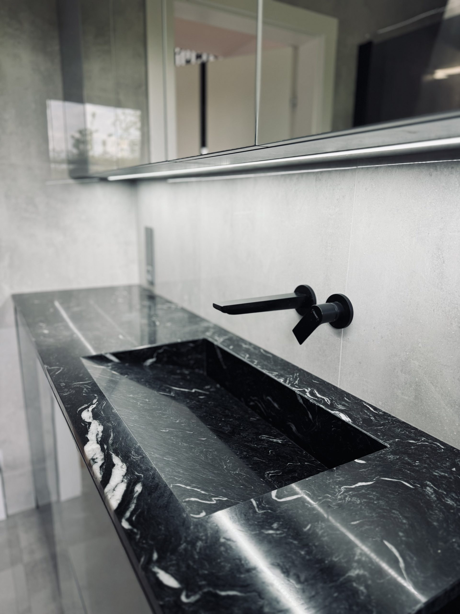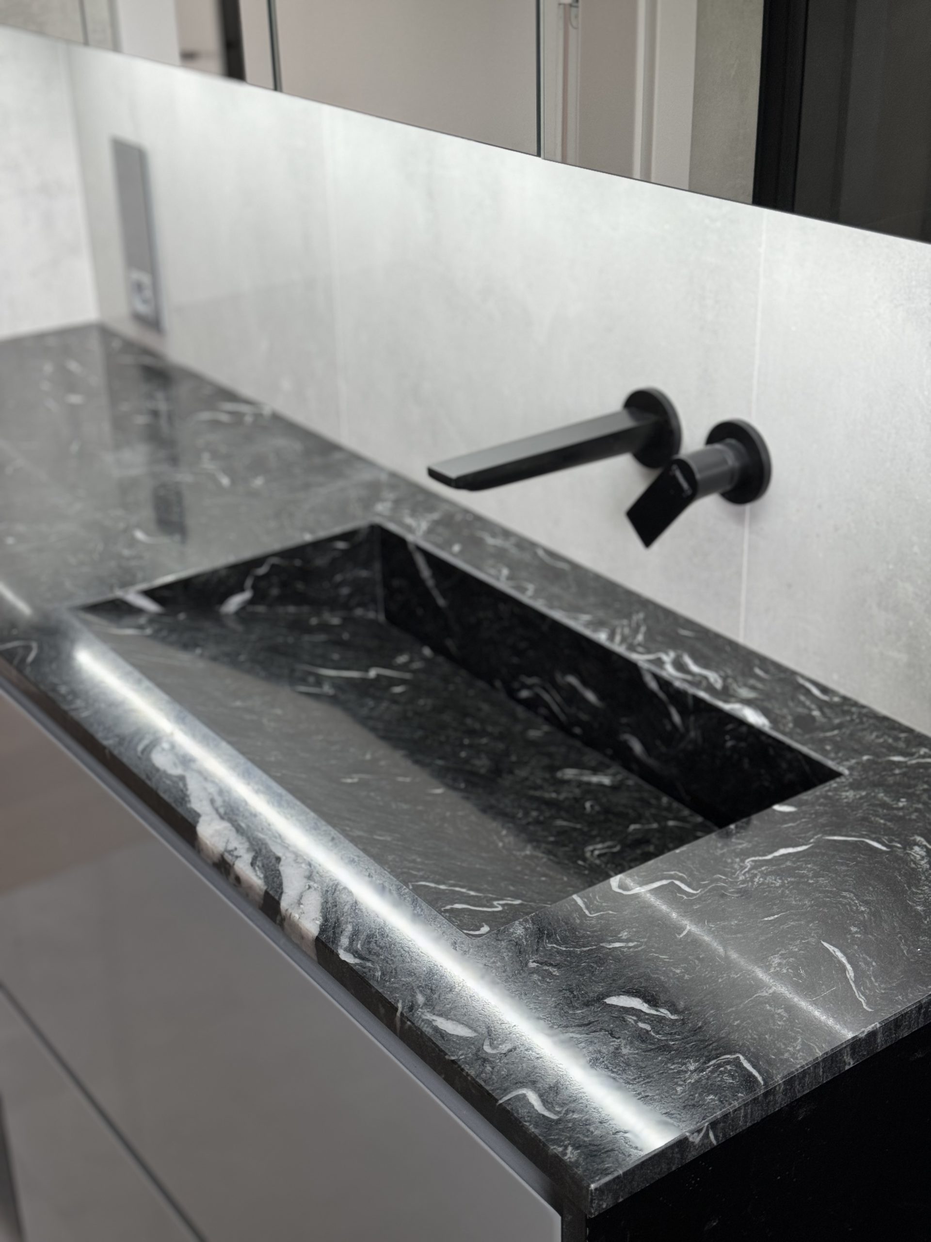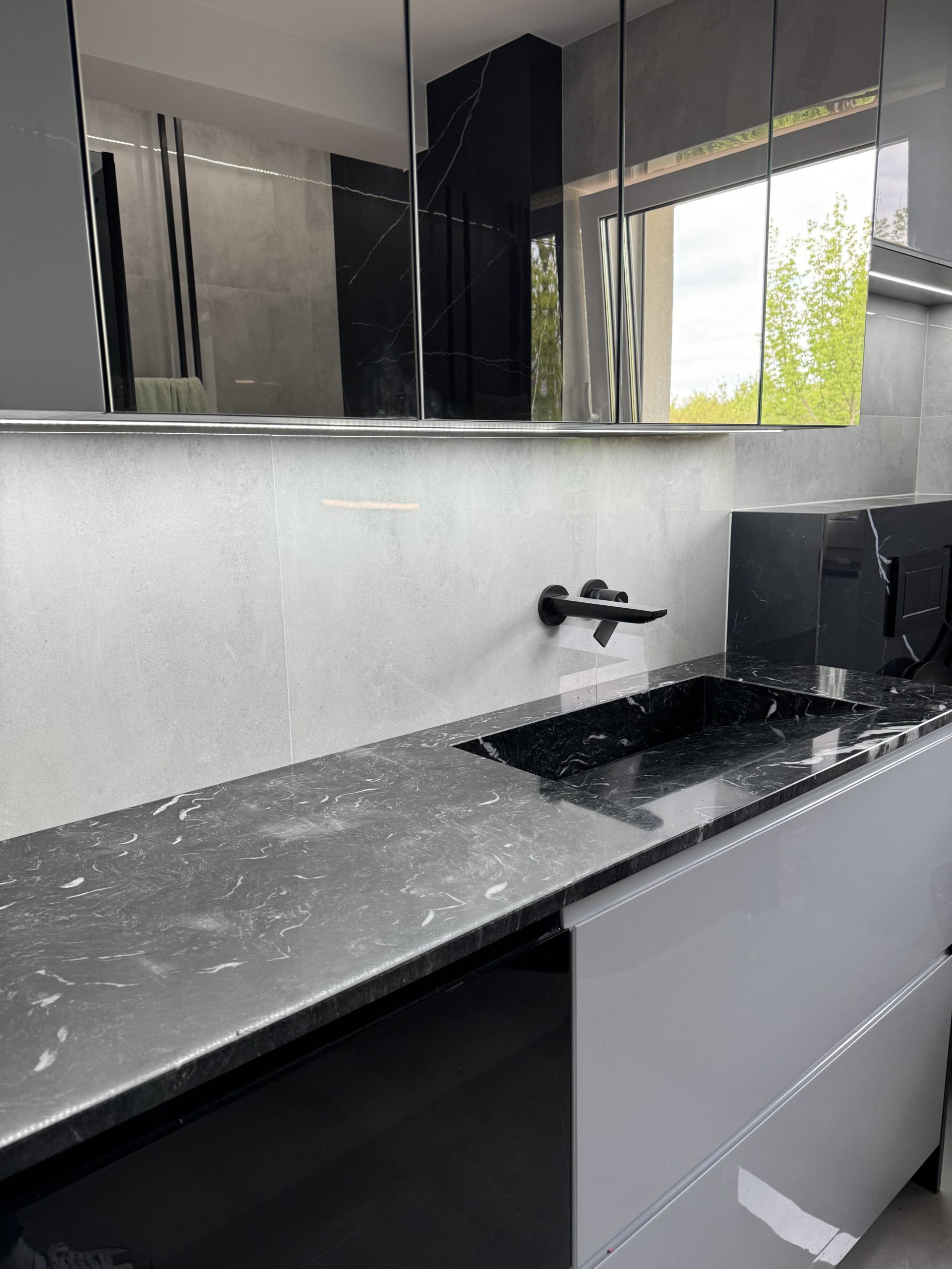 Prezentowany blat łazienkowy został wykonany z granitu Black Laguna, który wyróżnia się głęboką, czarną kolorystyką przełamaną jasnym, naturalnym użyleniem. To połączenie sprawia, że wnętrze nabiera nowoczesnego i eleganckiego charakteru, a cała łazienka staje się przestrzenią wyjątkową. Dzięki odporności granitu na wilgoć i zarysowania, blat zachowuje swój piękny wygląd przez długie lata, nawet przy intensywnym użytkowaniu.