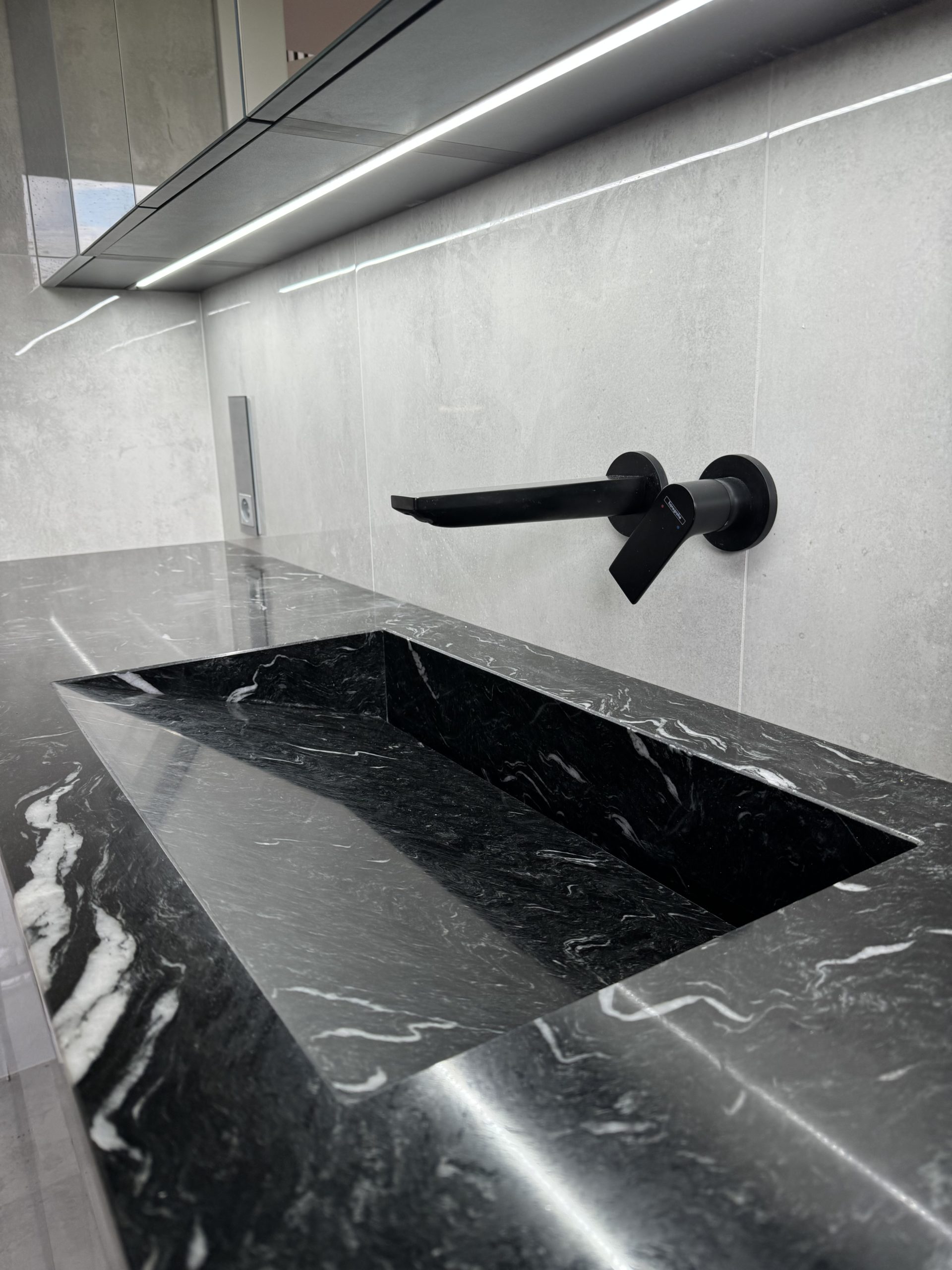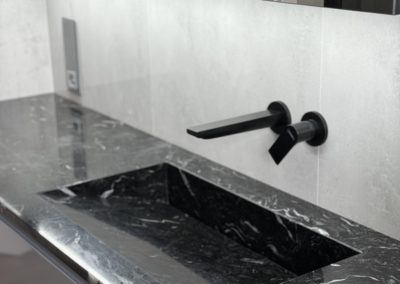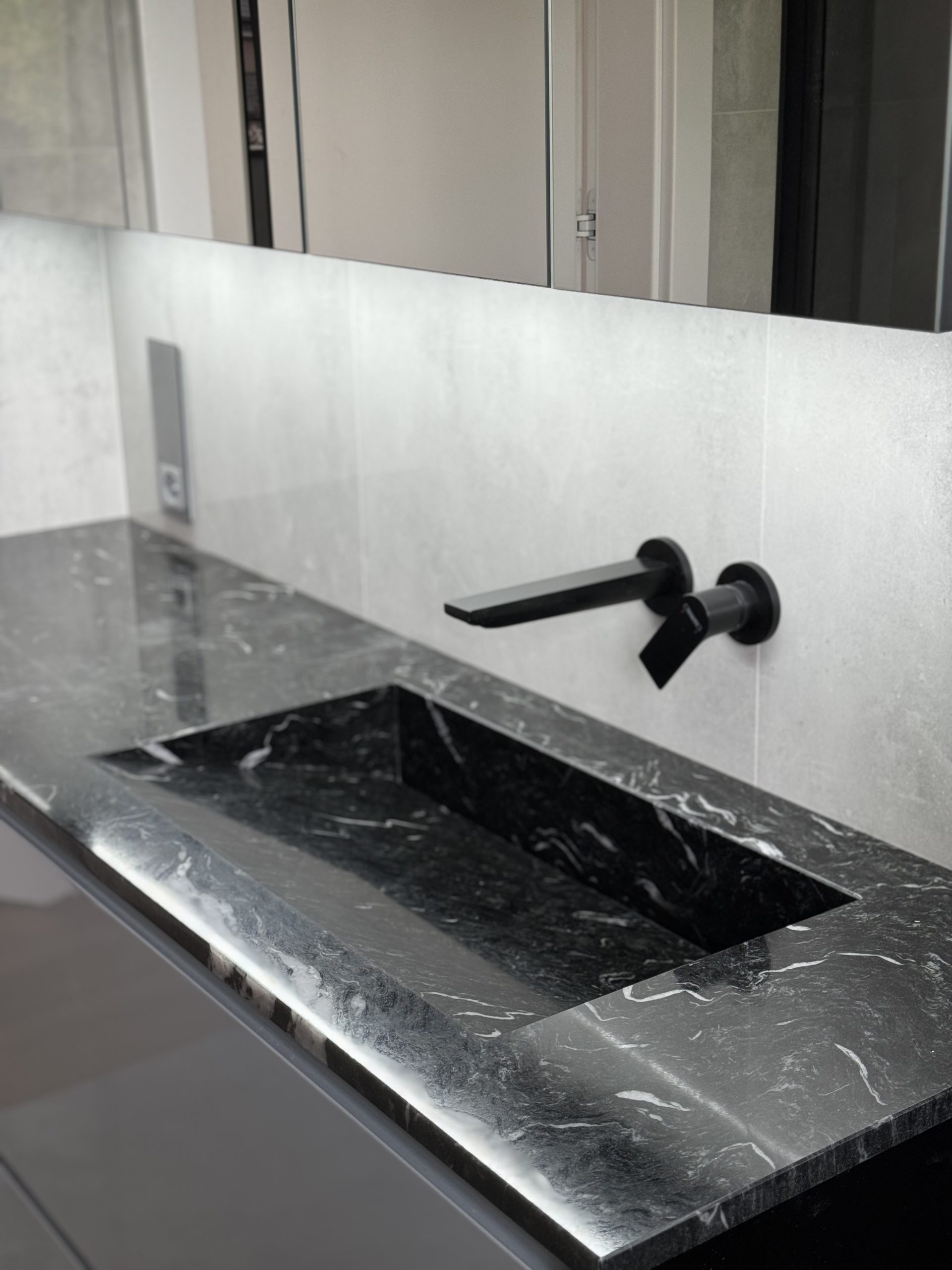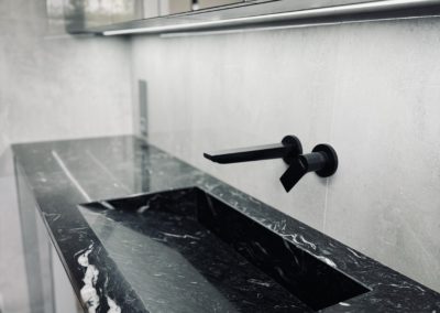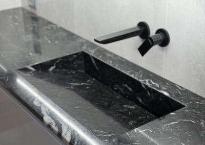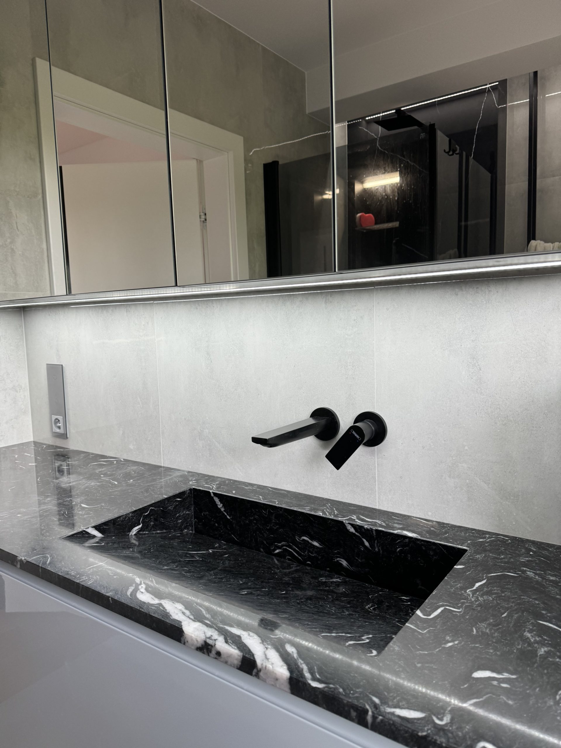 Prezentowany blat łazienkowy został wykonany z granitu Black Laguna, który wyróżnia się głęboką, czarną kolorystyką przełamaną jasnym, naturalnym użyleniem. To połączenie sprawia, że wnętrze nabiera nowoczesnego i eleganckiego charakteru, a cała łazienka staje się przestrzenią wyjątkową. Dzięki odporności granitu na wilgoć i zarysowania, blat zachowuje swój piękny wygląd przez długie lata, nawet przy intensywnym użytkowaniu.